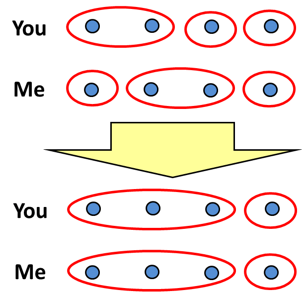 Or here’s another one: suppose again that we’re Bayesians with common priors, and we’re having a conversation, where I tell you my opinion (say, of the probability Hillary will win the election). Not any of the reasons or evidence on which the opinion is based—just the opinion itself. Then you, being Bayesian, update your probabilities to account for what my opinion is. Then you tell me your opinion (which might have changed after learning mine), I update on that, I tell you my new opinion, then you tell me your new opinion, and so on. You might think this could go on forever! But, no, Geanakoplos and Polemarchakis observed that, as long as there are only finitely many possible states of the world in our shared prior, this process must converge after finitely many steps with you and me having the same opinion (and moreover, with it being common knowledge that we have that opinion). Why? Because as long as our opinions differ, your telling me your opinion or me telling you mine must induce a nontrivial refinement of one of our knowledge partitions, like so:
