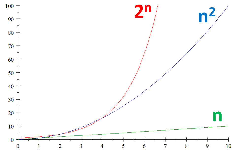 The difference is, n and even n2 grow in a more-or-less manageable way, but 2n just shoots up off the screen. The shooting-up has real-life consequences—indeed, more important consequences than just about any other mathematical fact one can think of.