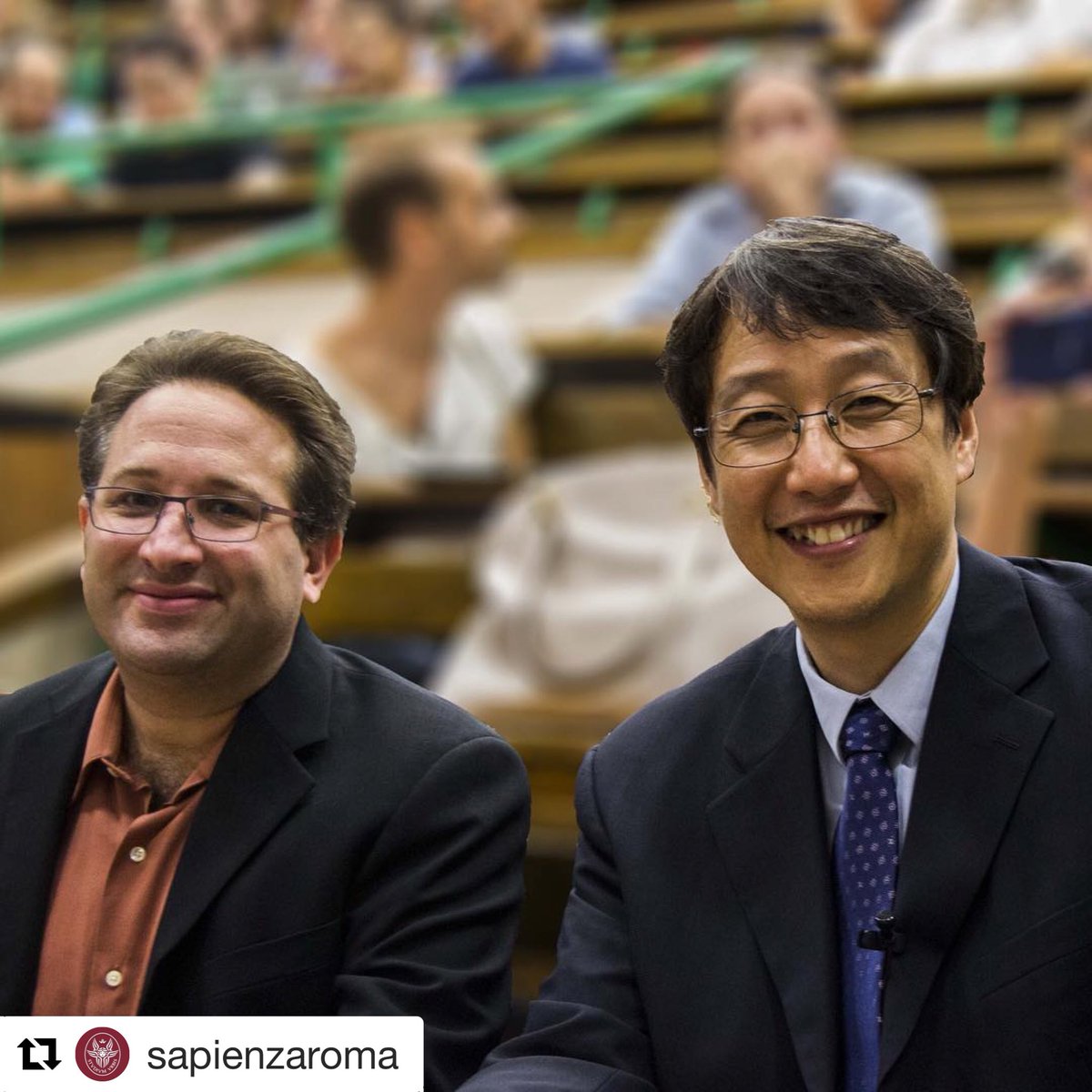 On Thursday, I had the incredible honor of accepting the 2018 Tomassoni-Chisesi Prize in Physics at Università “La Sapienza” in Rome—“incredible” mostly because I’m of course not a physicist. (I kept worrying they’d revoke the award when they realized I could barely solve the wave equation.) This is not the first time quantum information was recognized; the prize has previously gone to Serge Haroche and Alain Aspect. This year, for the first time, there was both an under-40 and an over-40 award; the latter went to Philip Kim, a quantum materials researcher at Harvard who I had the privilege to meet on this trip (he’s the taller one below).